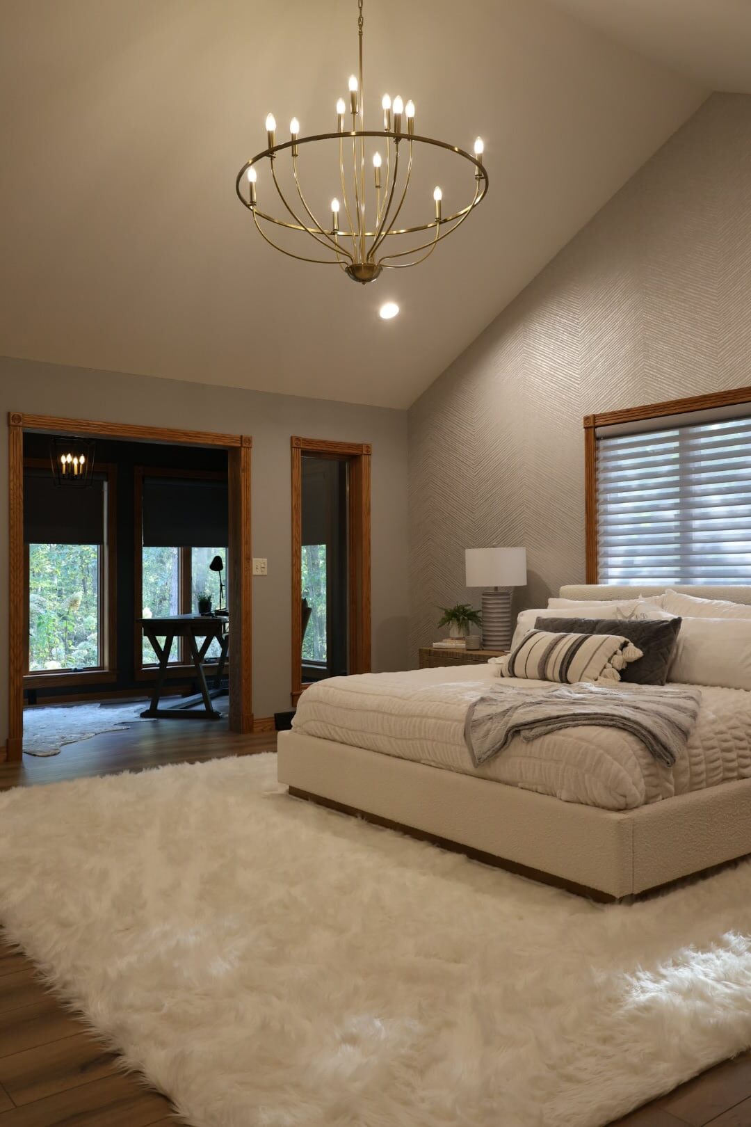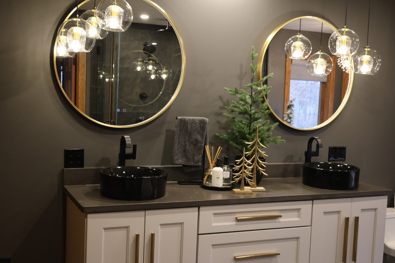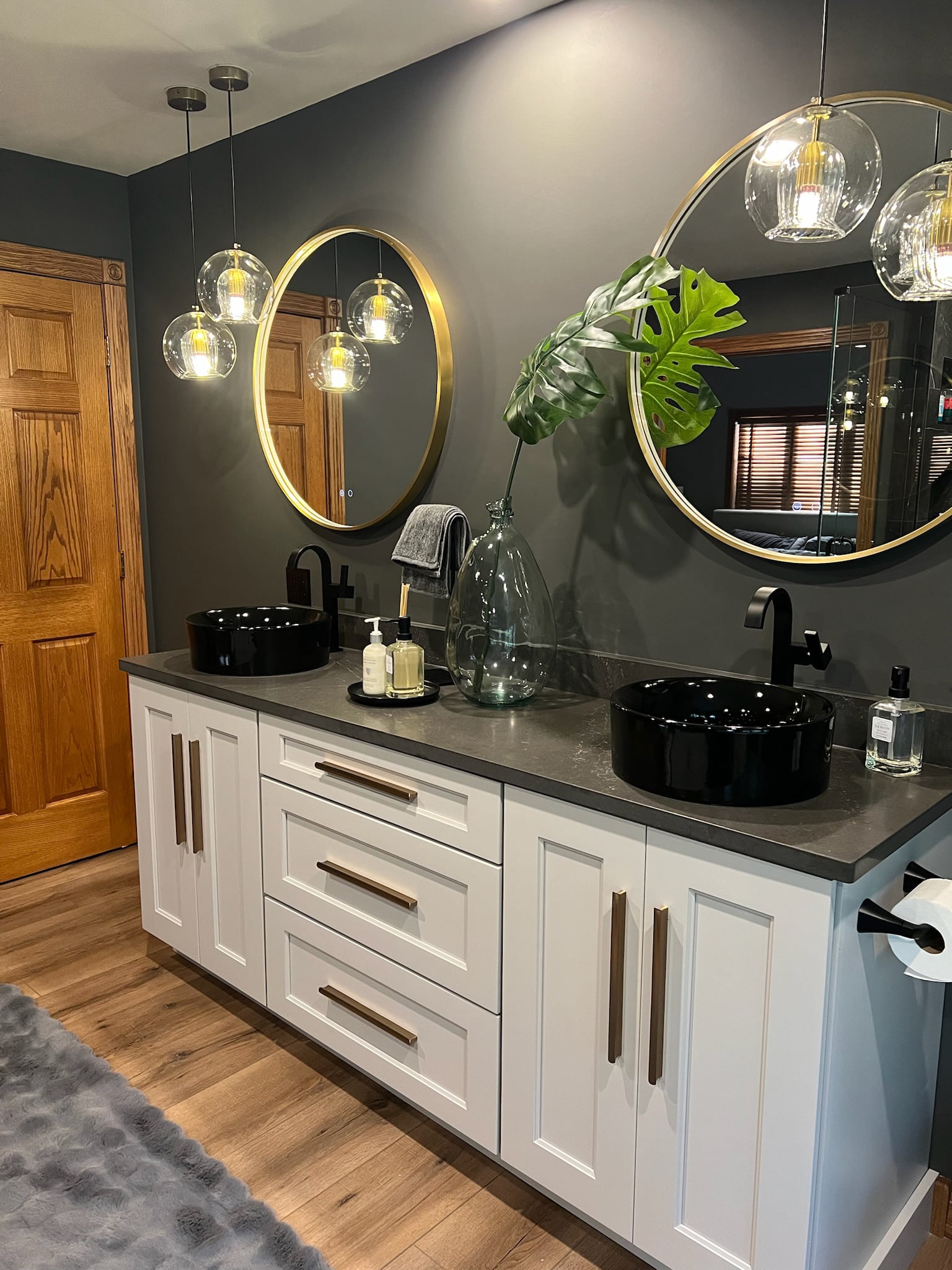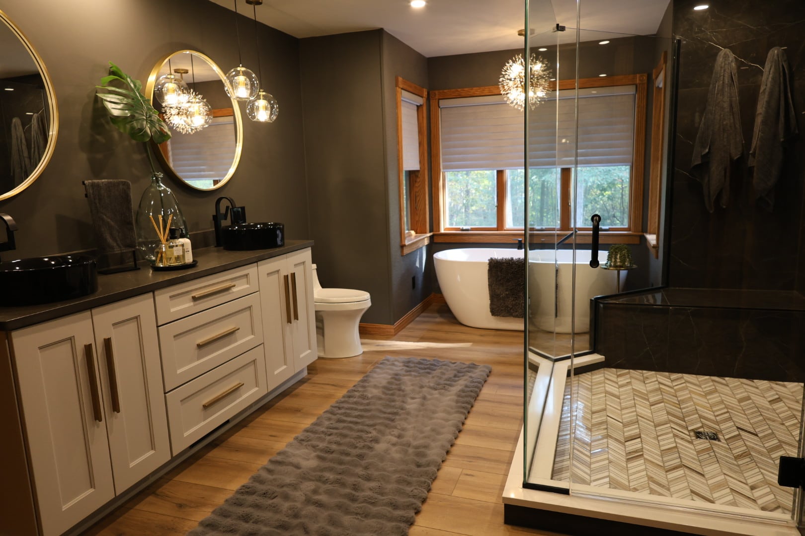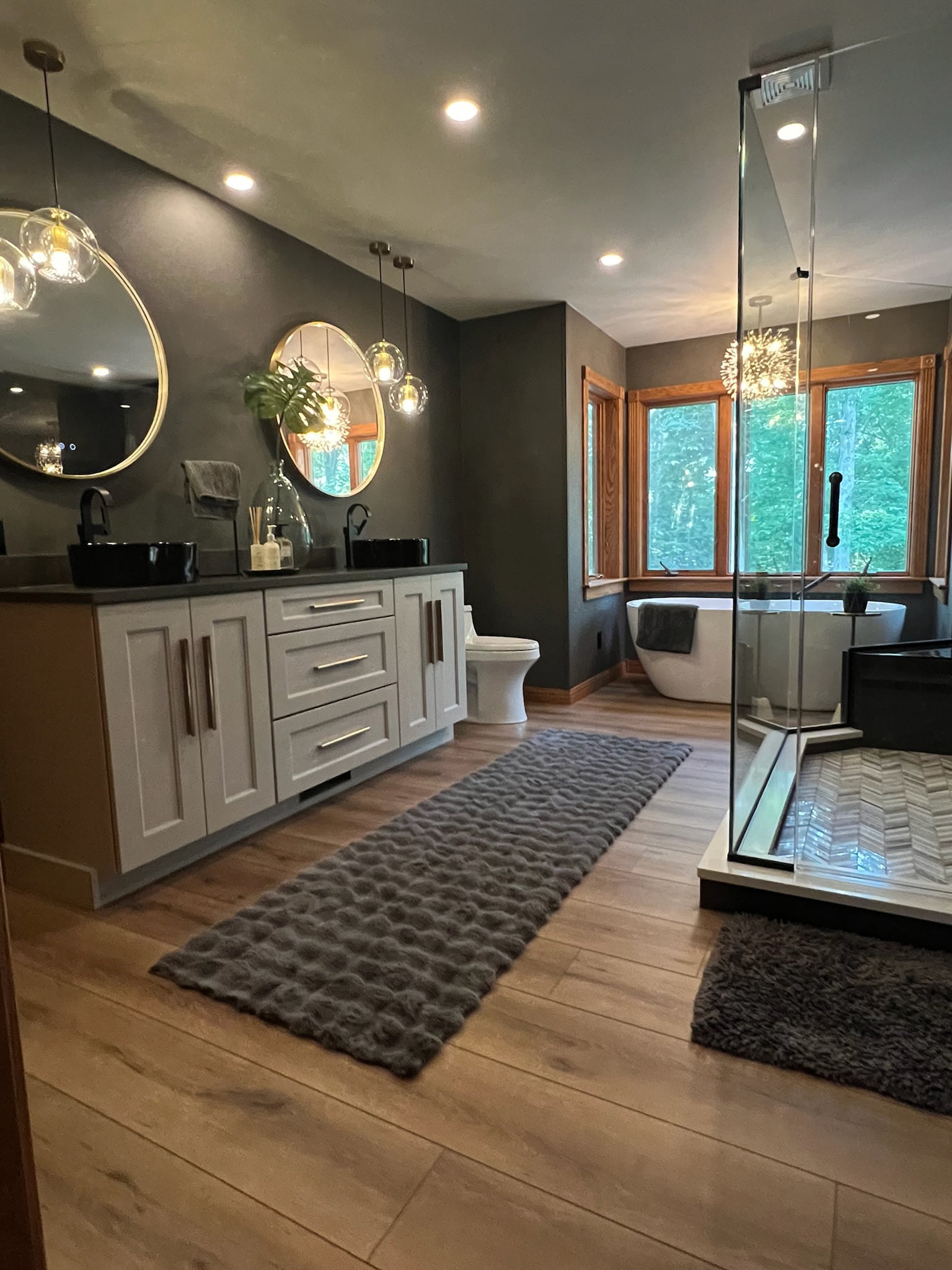 Step inside a serene blend of rustic charm and modern sophistication in our latest remodel—a seamless transformation of a bathroom, bedroom, and home office into a warm, cohesive retreat. Each space was thoughtfully curated with furniture, fixtures, and finishes that celebrate texture, natural tones, and timeless design. In the bathroom, matte stone counters and black sinks pair wonderfully with weathered wood accents and handmade ceramic tiles, all grounded by a soft, neutral rug that adds comfort underfoot. The bedroom exudes a cozy, layered aesthetic by bringing elements of nature into the room through distressed wood furniture, modern wallpaper designs elegantly simple lighting fixtures. In the office, a two-tone wood desk flanked by rich leather seating sits under a modern, farmhouse light with panoramic views of the forest that would make even Thoreau jealous. Throughout the remodel, every selection was made to harmonize with the rustic chic design style—where nature meets refined finishes and functionality. The result is a trio of spaces that feel intentionally connected and effortlessly lived in.