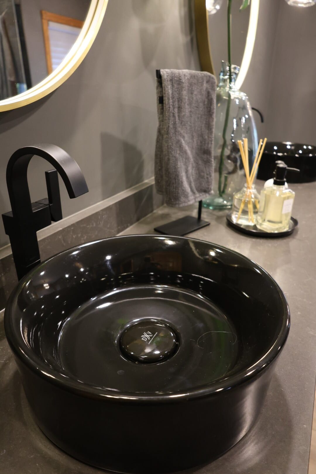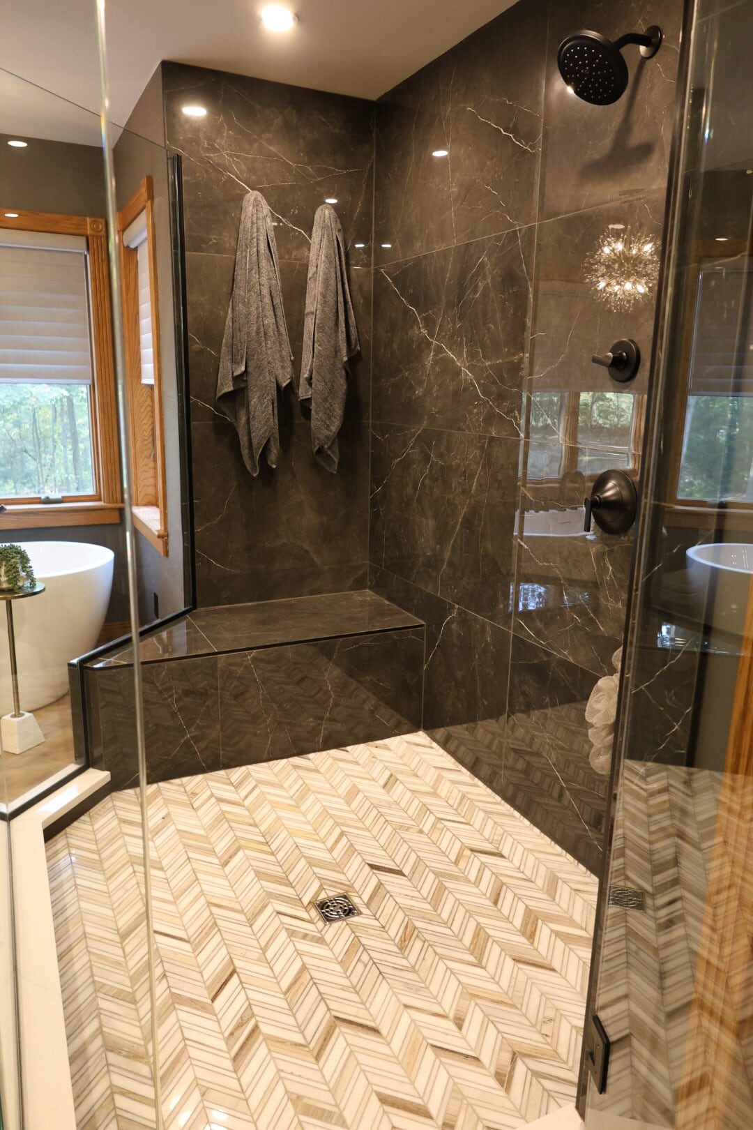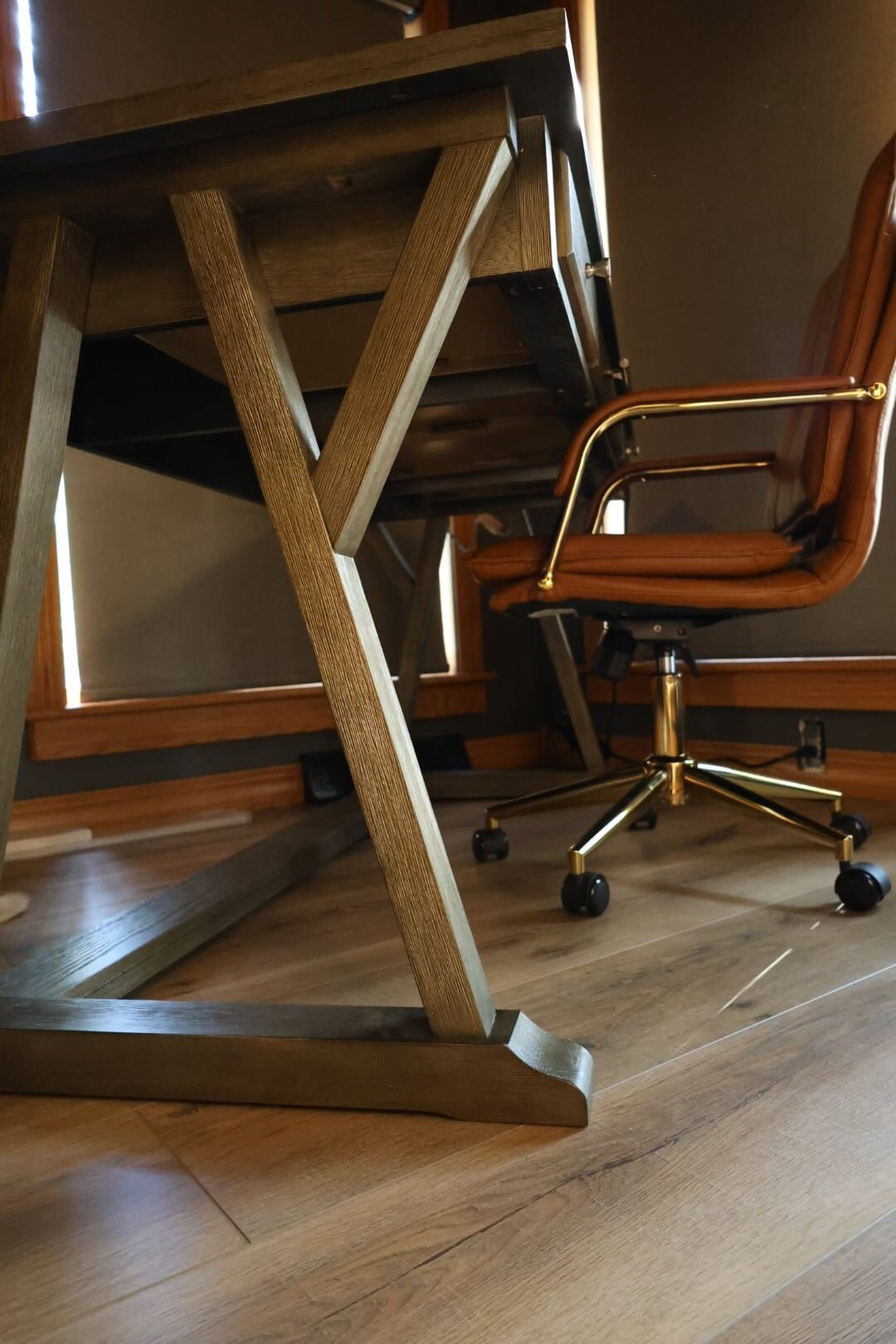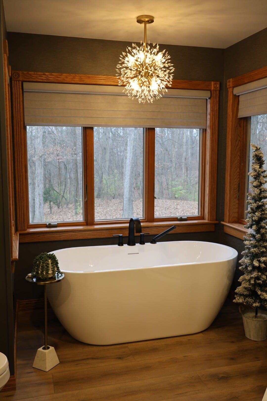 Step inside a serene blend of rustic charm and modern sophistication in our latest remodel—a seamless transformation of a bathroom, bedroom, and home office into a warm, cohesive retreat. Each space was thoughtfully curated with furniture, fixtures, and finishes that celebrate texture, natural tones, and timeless design. In the bathroom, matte stone counters and black sinks pair wonderfully with weathered wood accents and handmade ceramic tiles, all grounded by a soft, neutral rug that adds comfort underfoot. The bedroom exudes a cozy, layered aesthetic by bringing elements of nature into the room through distressed wood furniture, modern wallpaper designs elegantly simple lighting fixtures. In the office, a two-tone wood desk flanked by rich leather seating sits under a modern, farmhouse light with panoramic views of the forest that would make even Thoreau jealous. Throughout the remodel, every selection was made to harmonize with the rustic chic design style—where nature meets refined finishes and functionality. The result is a trio of spaces that feel intentionally connected and effortlessly lived in.